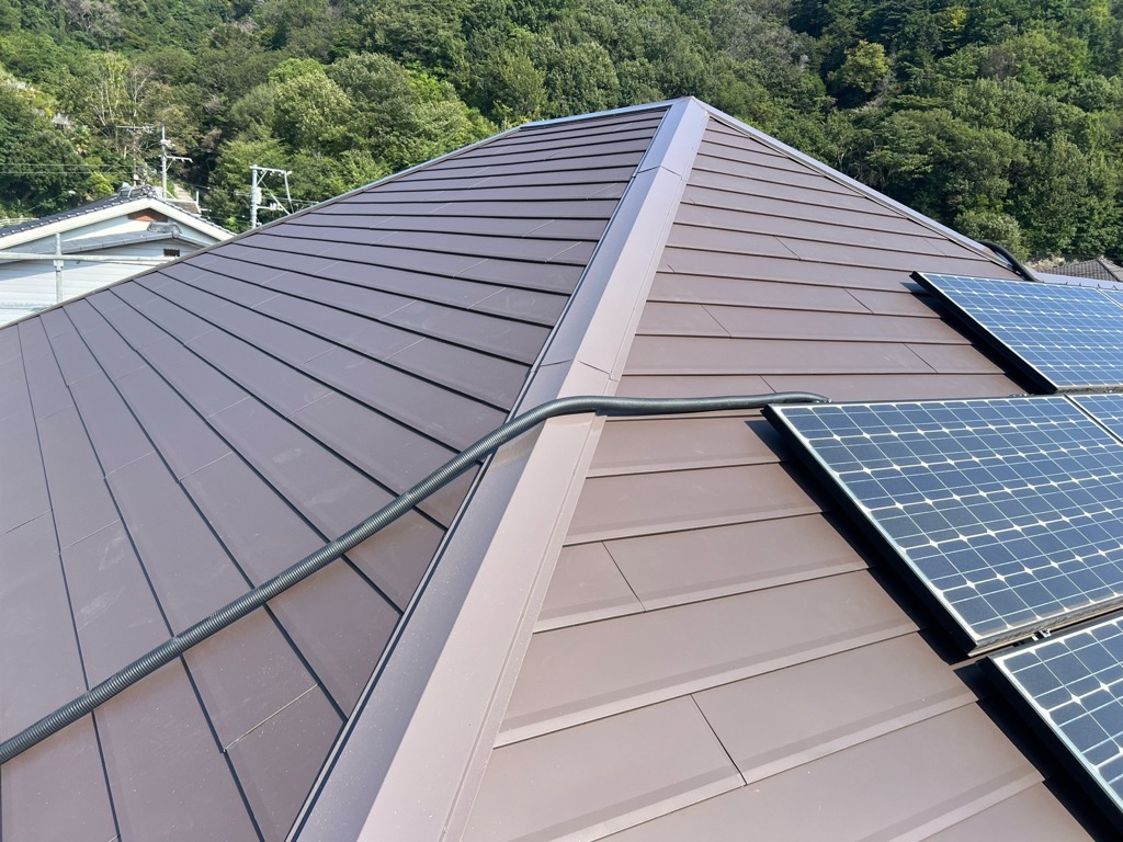 屋根には高耐久の金属屋根材「リコロニー」を、外壁には日本ペイント「パーフェクトトップ」を使用。